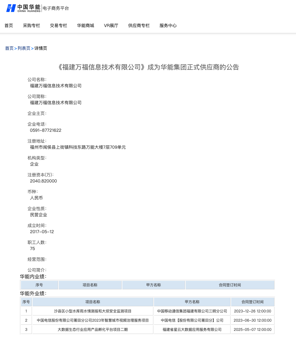 华能集团作为世界500强企业,对供应商的技术研发能力、产品质量把控、项目履约水平设立了极高的门槛。万福信息能够成功突围,得益于公司多年来在技术与项目实践中的双重积淀。公司近年来已为中国移动、中国电信、福建省星云大数据等头部企业,打造了多个标杆项目,覆盖数字生态文明多个领域,丰富的实战经验成为通过华能集团“严选”的硬核支撑。