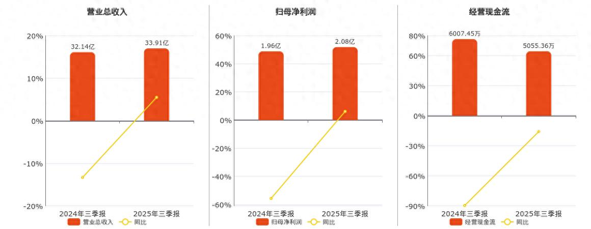 公司营业总收入为33.91亿元,在已披露的同业公司中排名第28。归母净利润为2.08亿元。经营活动现金净流入为5055.36万元,在已披露的同业公司中排名第34,较去年同报告期经营活动现金净流入减少952.09万元,同比较去年同期下降15.85%。
