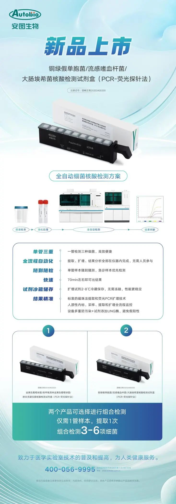 鉴于此,安图生物推出了铜绿假单胞菌/流感嗜血杆菌/大肠埃希菌核酸检测试剂盒(PCR-荧光探针法)。该产品具有高灵敏度和高特异度,可提升细菌阳性检出率,指导临床精准诊疗。此外,该款试剂可搭载安图全自动化核酸检测设备,做到随来随测,快速精准,最大程度提升了实验室核酸检测的效率。