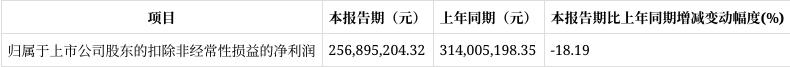 归属于上市公司股东的扣除非经常性损益的净利润为2.57亿元,较上年同期的3.14亿元下降18.19%。扣非净利润剔除了非经常性损益的影响,更能反映公司主营业务的盈利能力。