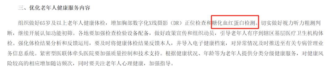 2025年6月,国家相关部门发布《关于做好2025年基本公共卫生服务工作》的通知中,明确提出普及65岁以上人群糖化血红蛋白(HbA1c)检查的建议。