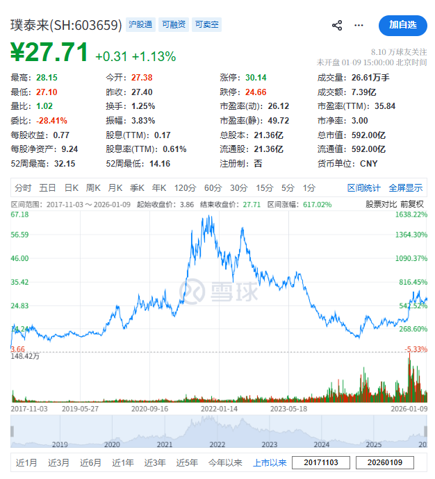 璞泰来(603659.SH)于2017年10月3日在上交所上市,截至2026年1月9日收市,其总市值约592亿元人民币。