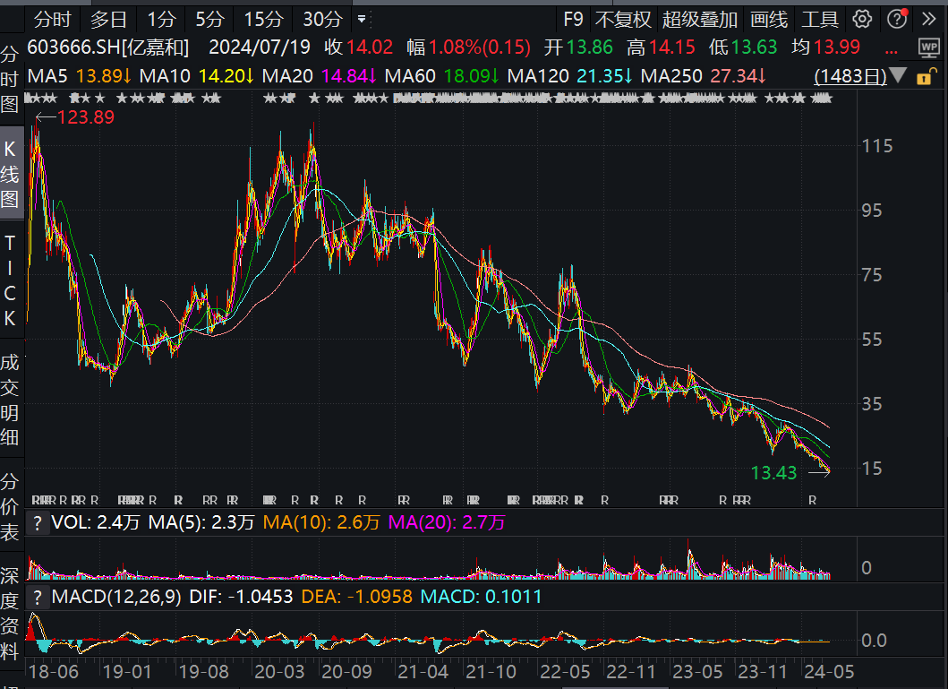 7月18日,亿嘉和(603666.SH)的股价最低跌至13.43元,这一价格也创出了该股上市以来的最低价格。