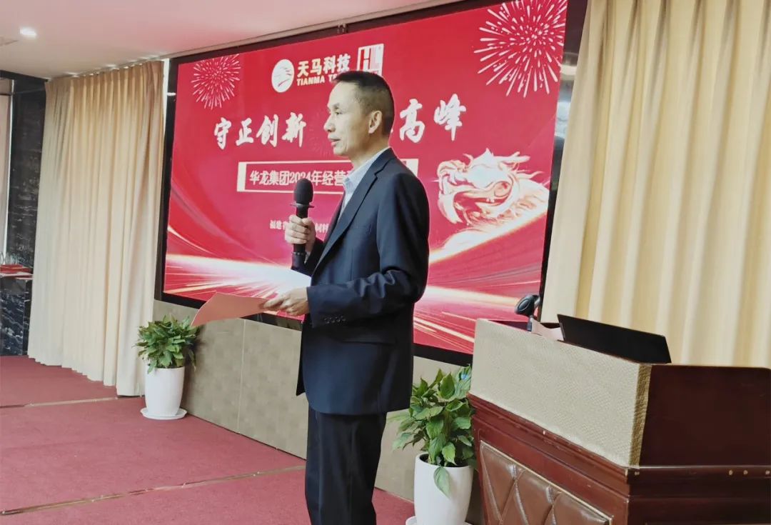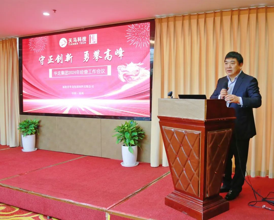 天马科技讯 1月19日,天马科技集团旗下华龙集团2024年经营工作会议在福州胜利召开。本次会议总结了华龙集团2023年度的工作成果,明确了2024年发展目标,并为之制定了行之有效的发展计划,为集团2024年高质量发展奠定坚实基础。天马科技集团董事长陈庆堂先生出席会议并作重要讲话,华龙集团董事长曾丽莉、总经理陈文忠、各副总经理,各子(孙)公司总经理等经营管理人员、骨干精英70多人参加会议。