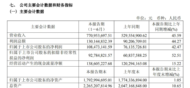 看 2025 年中报的数据,上半年营收 7.7 亿元,比去年同期涨了 45.6%;净利润 1.1 亿元,涨了 42.5%;扣非净利润 0.9 亿元,更是涨了 52.5%。