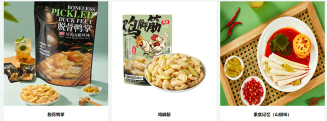 2024 年 8 月,69.9 元一袋的山椒味脱骨鸭掌卖了 20 多万件,拿了夏日开胃榜第一,光一个月就卖了 1400 万元左右。后来推的酸汤双萃、素菜系列也不错,前者月销破千万,后者几百万,只是现在已经下架换新了。