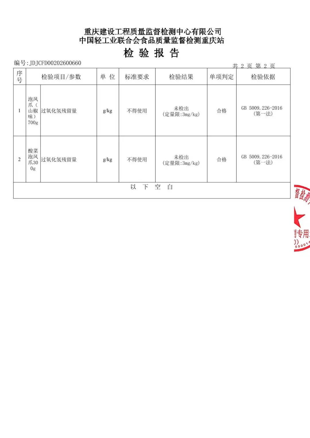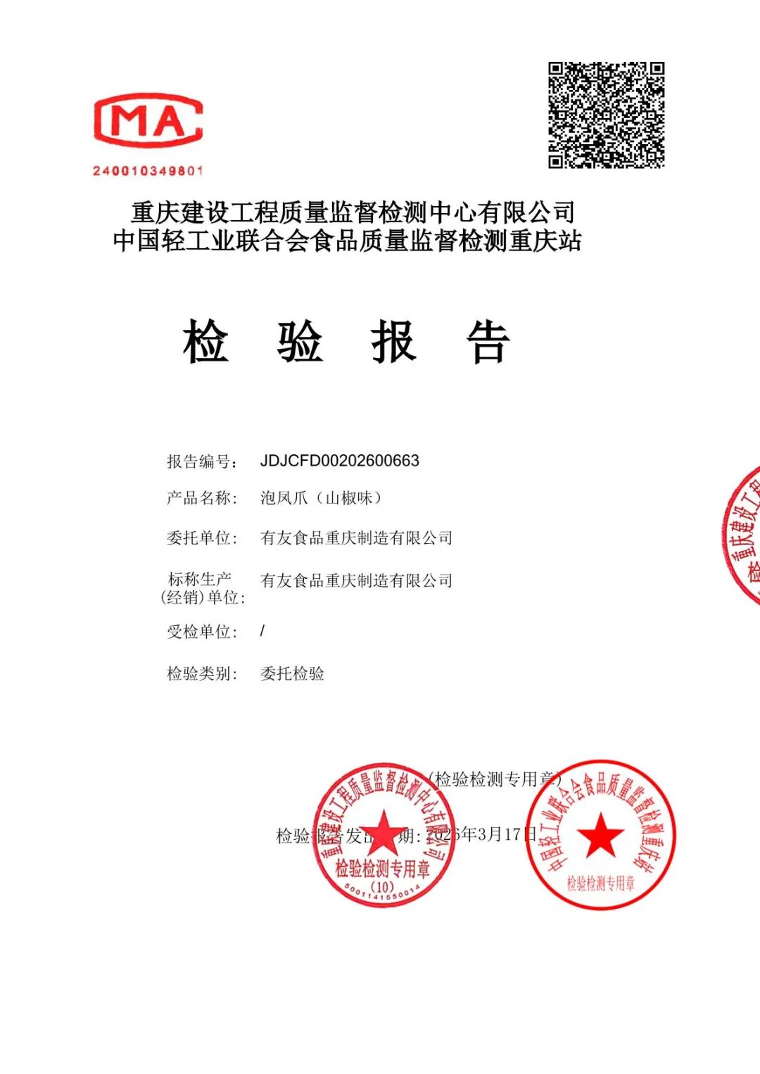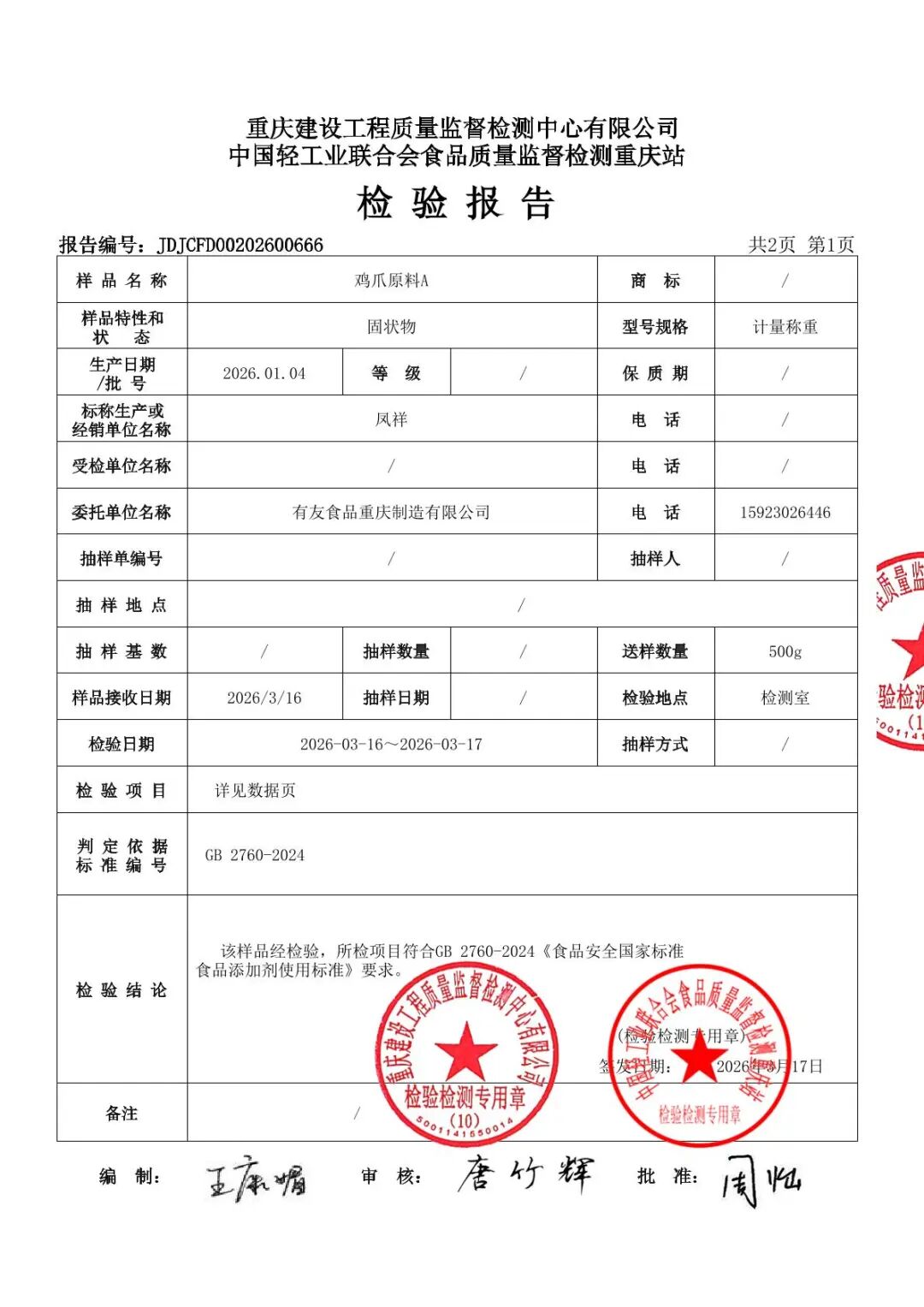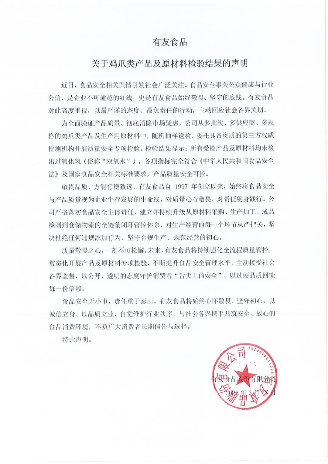 有友食品关于鸡爪类产品及原材料检验结果的声明