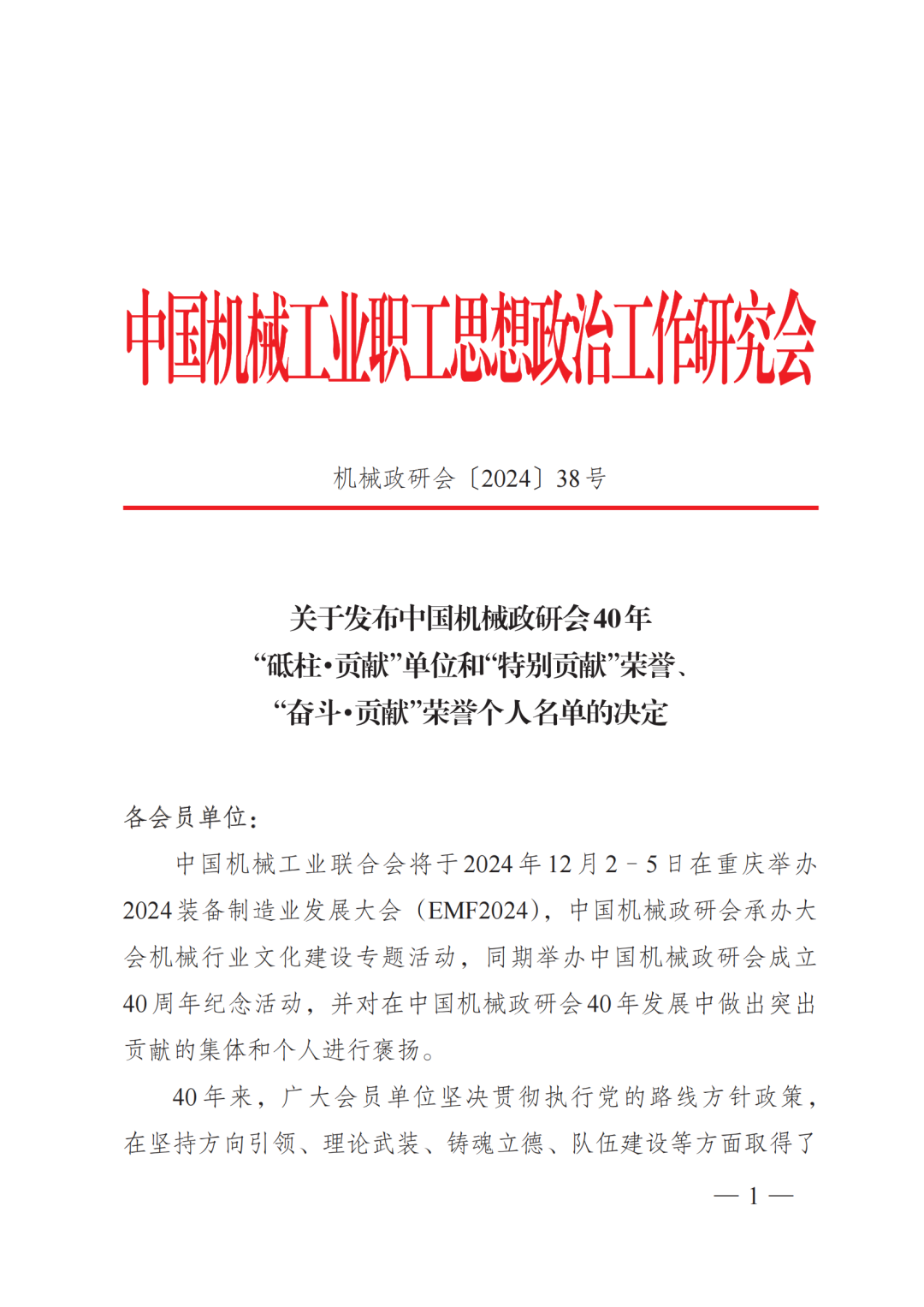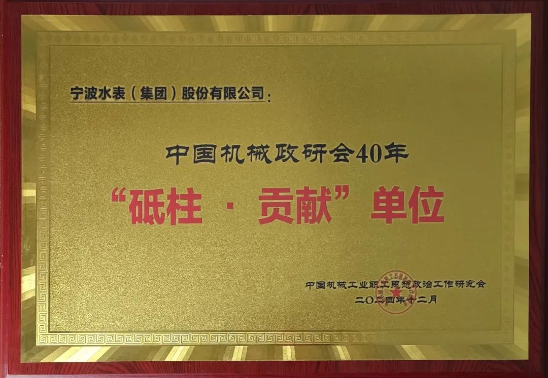 近日,2024装备制造发展大会“机械工业精神助力机械工作高质量发展”论坛在重庆隆重召开。国务院国资委原副主任、中国机械工业联合会专家委员会名誉主任王瑞祥,国务院国资委原监事会主席贾成炳,中国机械工业联合会党委副书记、中国机械政研会理事长薛一平,中机联党委常委赵驰、于清笈等领导出席活动。为表彰先进,把榜样的力量化为推动行业发展的动力,同期,中国机械政研会发布了40年“砥柱?贡献”单位和“特别贡献”荣誉、“奋斗?贡献”荣誉个人名单,其中,宁波水表(集团)股份有限公司(以下简称“宁水集团”或“公司”)获评中国机械政研会40年“砥柱?贡献”单位殊荣!