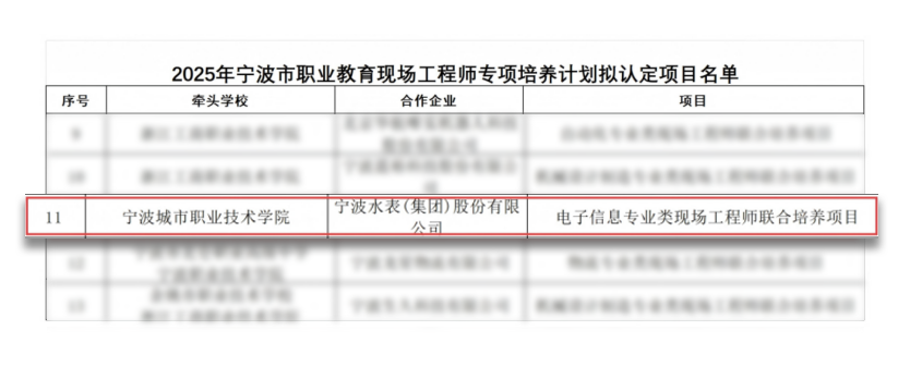 近期,宁波市教育局正式公布2025年度职业教育现场工程师专项培养计划项目名单。由宁波水表(集团)股份有限公司(以下简称“宁水集团”或“公司”)与宁波城市职业技术学院联合申报的“电子信息专业类现场工程师联合培养项目”成功入选,标志着宁水集团在产教融合、人才培育领域的实践获得官方认可。