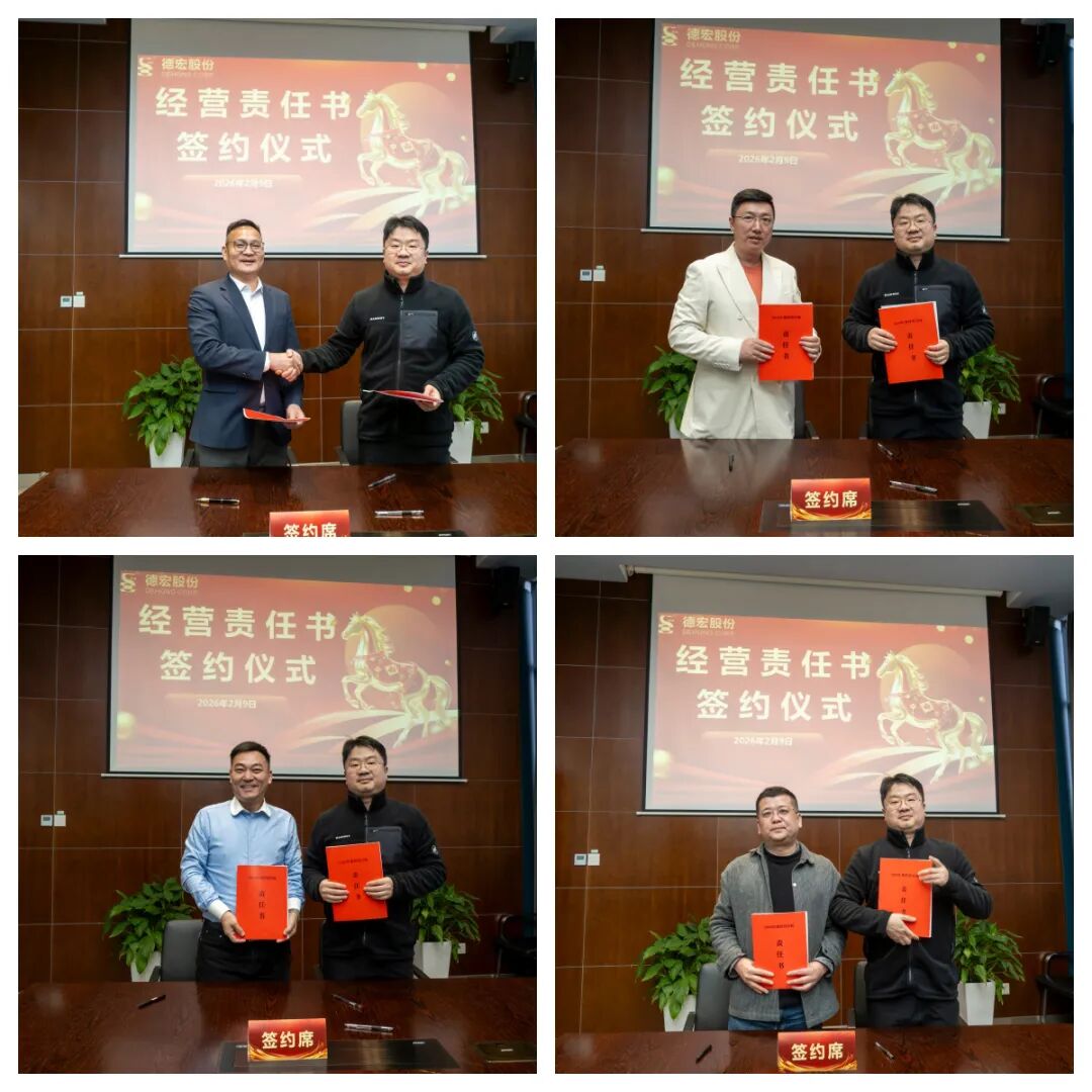 年终总结完成后,公司举行了2026年度经营目标责任书与党风廉政建设责任书签订仪式。各子公司负责人依次与集团公司总经理陈明签订了经营目标责任书,与集团公司党委书记秦迅阳签订了党风廉政建设责任书,以书面形式明确年度经营目标与廉政建设责任,标志着德宏股份“责任层层压实、目标精准落地”的管理体系进一步完善。此次双责任书签订,不仅凝聚了全体干部职工的发展共识,更筑牢了公司高质量发展的制度根基与纪律保障,为2026年各项工作的有序推进注入了强劲动力。