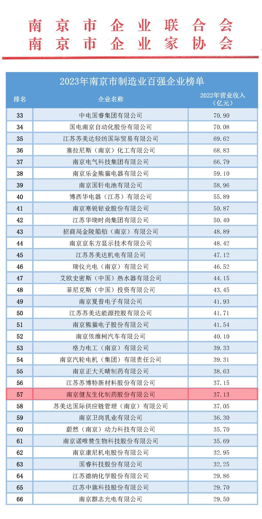 近日,南京市企业联合会、南京市企业家协会联合发布了南京市企业百强榜单。南京健友生化制药股份有限公司(以下简称“健友股份”)以2022年销售收入37.13亿元入围南京市制造业百强企业。这一荣誉不仅是对健友股份长期致力于建设国际一流生物制药公司的肯定,也是对其持续推动医药行业创新发展的赞誉。