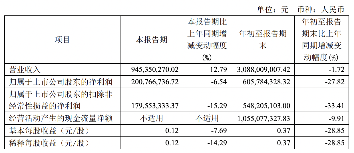 其中,第三季度营收为9.45亿元,同比增长12.79%;归属于上市公司股东的净利润2.01亿元,同比减少6.54%