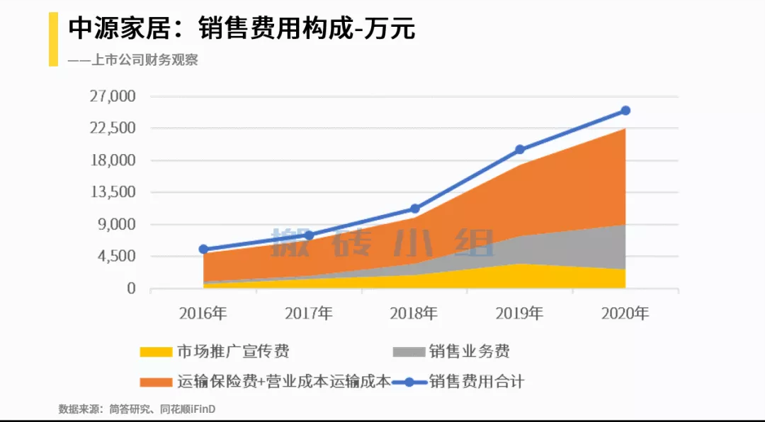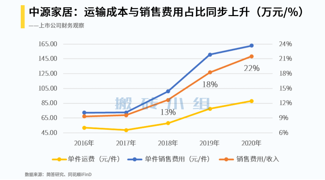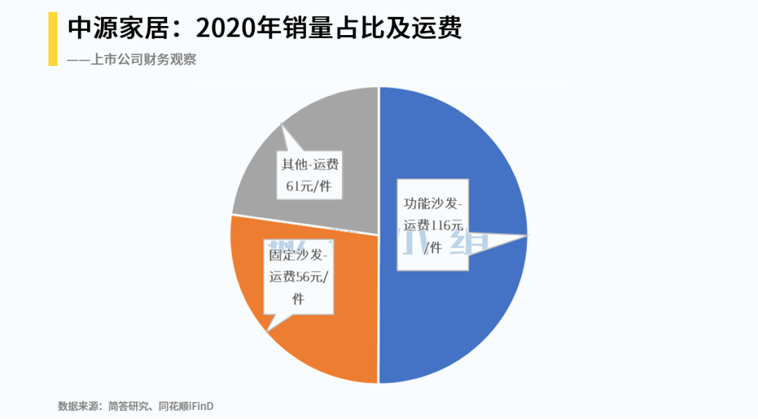 更具体的分析我们可以根据2020年报,中源家居2020年运输成本为1.34亿元。每卖一件沙发的运费从2016-2017年的50元上升到2020年85元,上涨70%。其中运费最贵的恰好是公司核心产品“功能沙发”,116元的平均运费占平均售价的12%。从结果上来说,公司赚的毛利润大部分被运输费用消耗掉了。