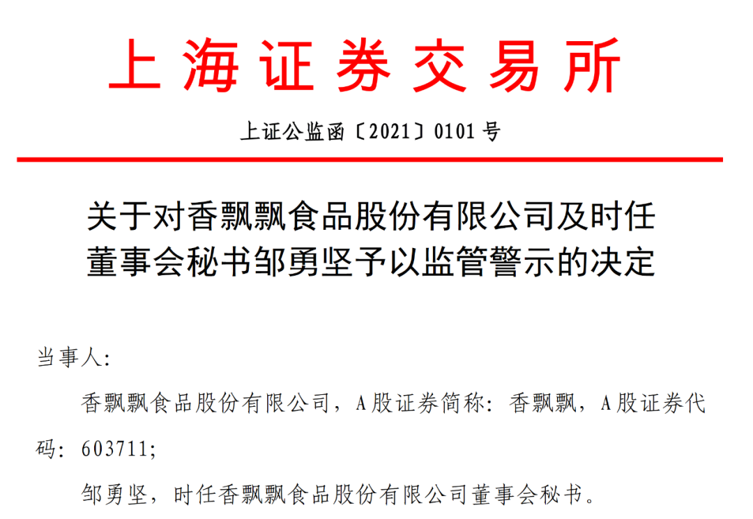 鉴于上述违规事实和情节,根据有关规定,上交所做出如下监管措施决定,对香飘飘及时任董事会秘书邹勇坚予以监管警示。