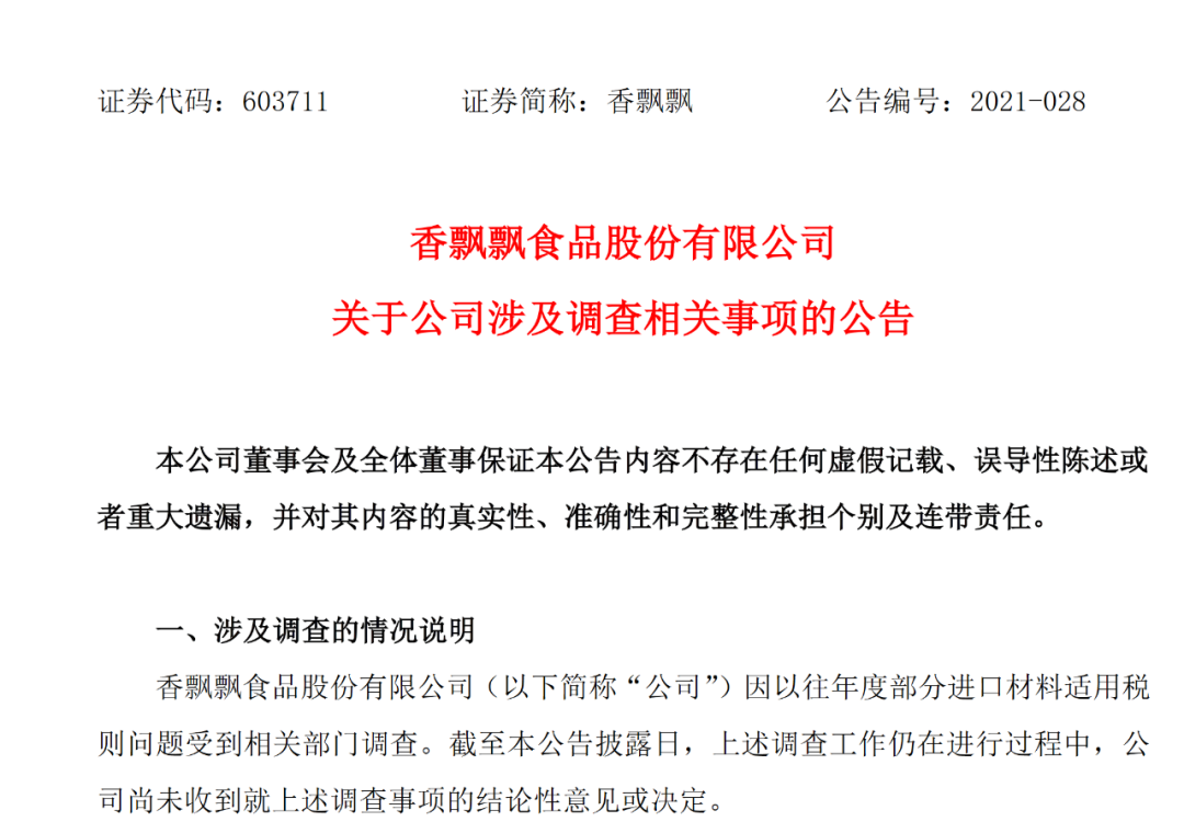 《五谷财经》注意到,香飘飘因以往年度部分进口材料适用税则问题受到相关部门调查。截至本公告披露日(4月29日),上述调查工作仍在进行过程中,香飘飘尚未收到就上述调查事项的结论性意见或决定。