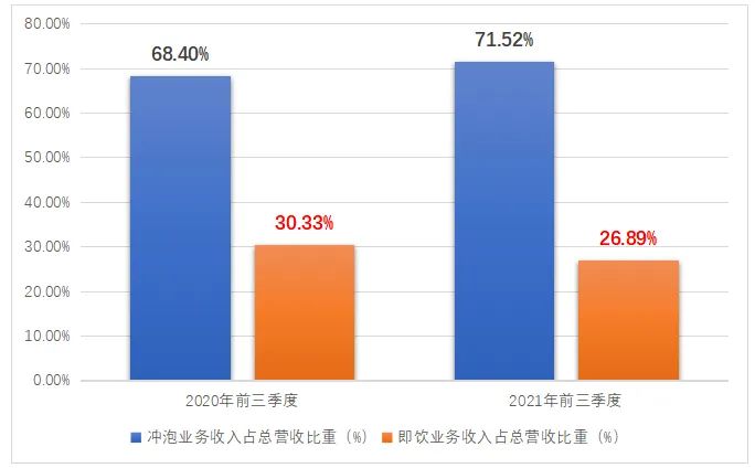 具体分业务来看,冲泡业务所贡献的收入仍占据香飘飘当期总营收的较大比重,且由2020年前三季度的68.40%进一步增至2021年前三季度的71.52%。与此同时,香飘飘的即饮业务却仅占公司当期总营收三成左右的比重,由2020年前三季度的30.33%缩水至2021年前三季度的26.89%。