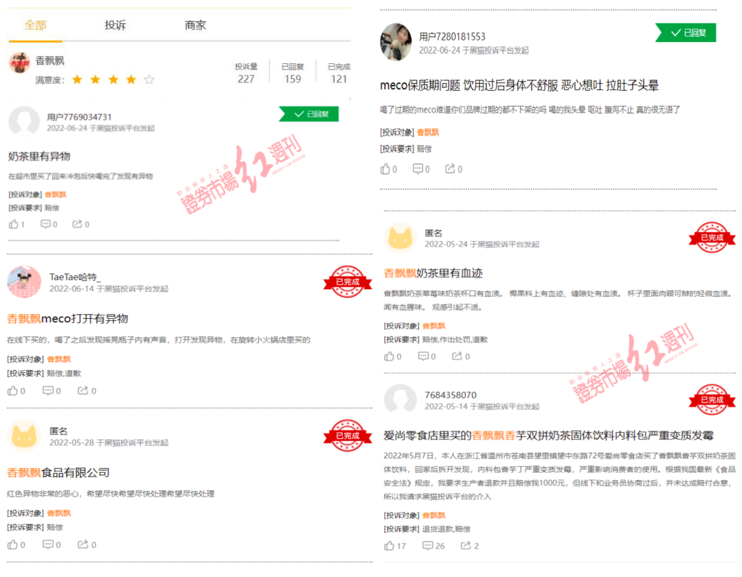 最重要的是,作为一家食品饮料企业,食品安全不仅是香飘飘的生命线,也是其立足之本。而《红周刊》在黑猫投诉平台发现,截至9月23日,香飘飘共有227条投诉,其中涉及产品中出现异物、奶茶变质发霉、产品过保质期等食品质量问题,还有虚假宣传以及售后等诸多问题。无法保障产品品控,屡涉食品安全红线,这说明香飘飘在公司治理方面还存在不小漏洞的。