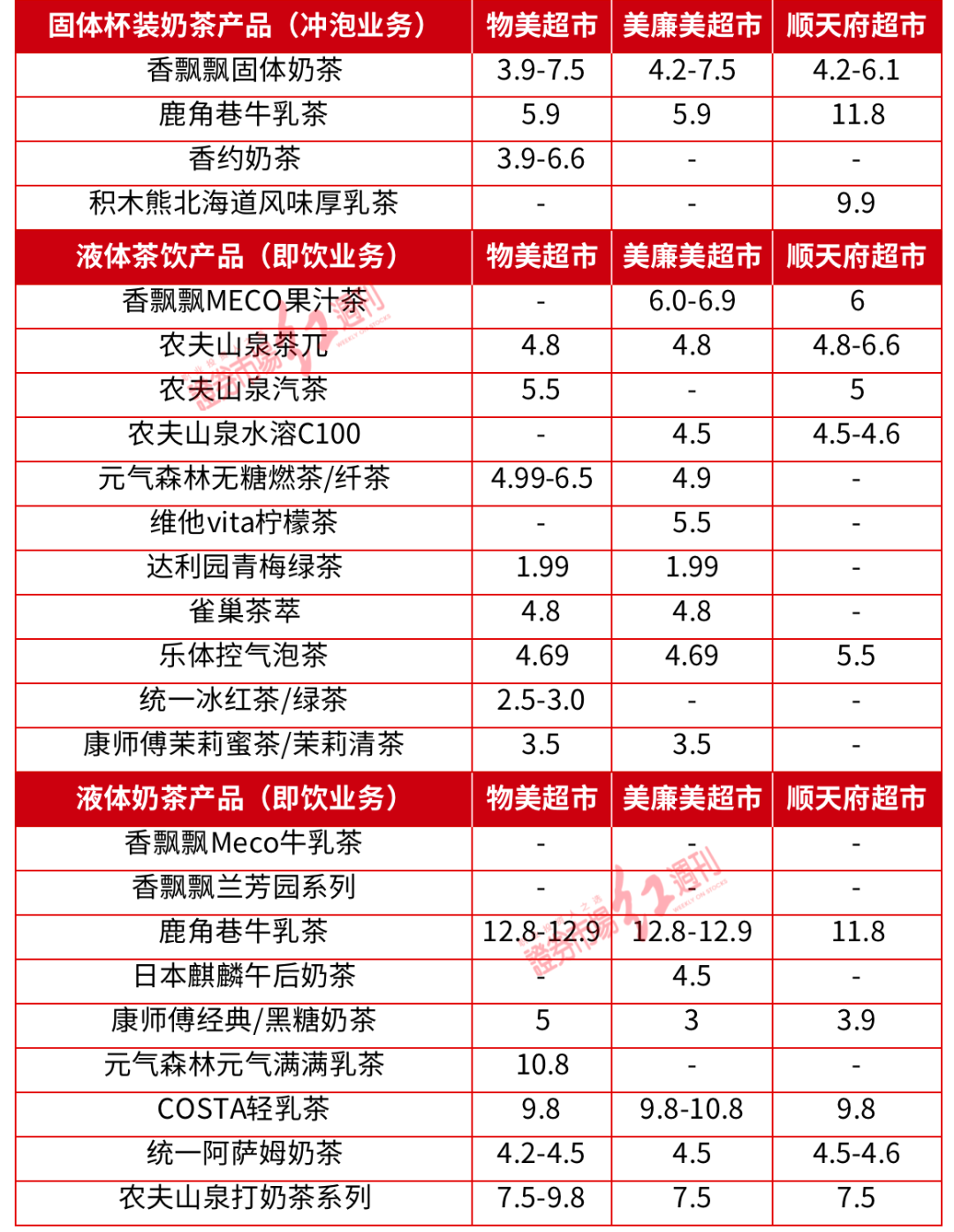 在《红周刊》走访的3家大型商超中,顺天府超市(府右街店)的冲泡类货架和即饮类货架前后相邻,算是距离最近的两类货架;物美超市(积水潭店)两类货架的中间隔着一条走道,间距较大,且处于斜对角的位置;美廉美超市(西安门店)最远,MECO果汁茶在一层饮料区,固体杯装奶茶则在二层冷冻区旁的冲泡区,并且固体奶茶品类较少,口味不全,若消费者不仔细寻找,香飘飘杯装奶茶很容易淹没在琳琅满目的其他品牌产品之中。