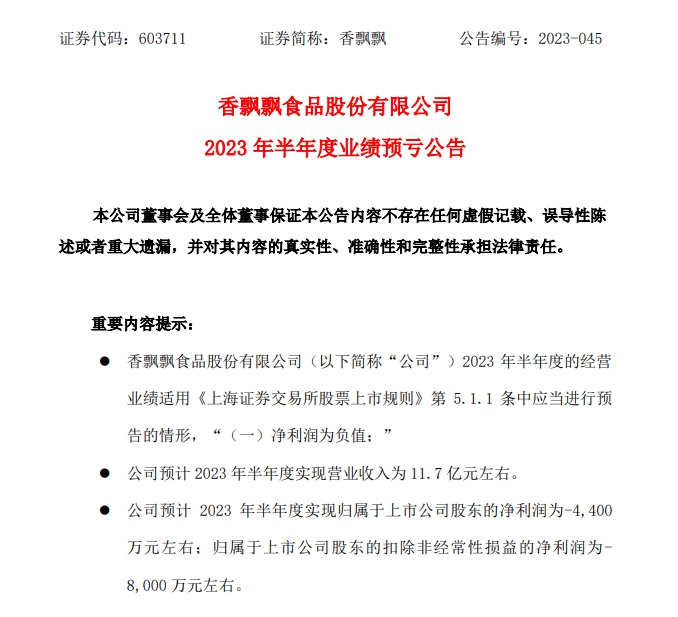 11日盘后,香飘飘发布2023年半年度业绩预亏公告,预计期内实现营收11.7亿元左右,同比增长36.05%左右;预计期内归属于上市公司股东的净利润为亏损4400万元左右,与上年同期相比,将减少亏损8522.49万元左右;预计期内扣非净利润为亏损8000万元左右,与上年同期相比,将减少亏损7112.69万元左右。