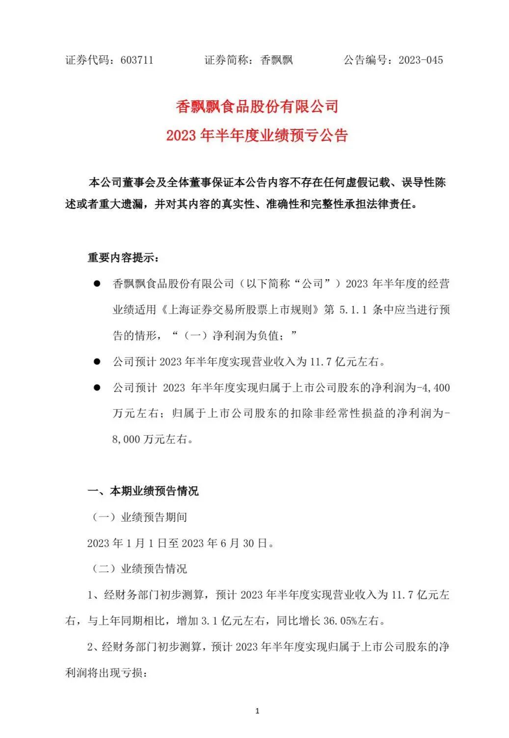 11日晚间,香飘飘发布公告称今年上半年预计实现营业收入约11.7亿元,归属于上市公司股东的净利润为亏损4400万元左右。