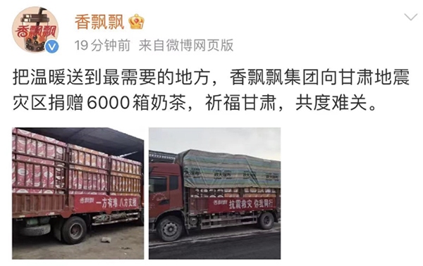 12月19日,香飘飘向甘肃灾区捐出首批6000箱奶茶物资,连夜将奶茶产品向灾区输送,驰援救助工作。