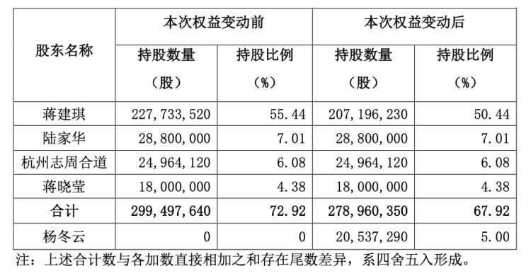 本次权益变动前,蒋建琪先生持有公司股份227,733,520股,占公司总股本的55.44%,蒋建琪先生及其一致行动人陆家华、蒋晓莹、杭州志周合道企业管理合伙企业(有限合伙)(以下简称“杭州志周合道”)合计持有公司股份299,497,640股,占公司总股本的72.92%。杨冬云先生未持有公司股份。
