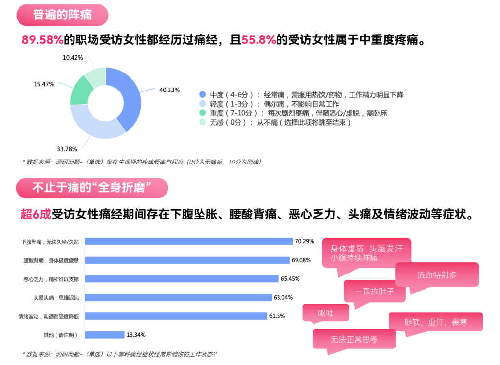 《2026职场女性生理期“带痛上班”调研》显示,近九成女性经历过痛经或经期不适,其中约55.8%为中重度痛经,常伴随恶心、头晕、虚脱等症状,足以影响正常工作状态。面对疼痛与不适,更多女性选择继续工作而非休息——九成以上的人不会因此请假,超过7成女性选择“带痛坚持”,折射出经期困境在职场长期处于“可感知却难言说”的状态。