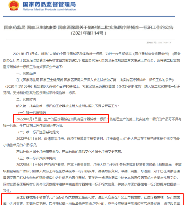国家卫健委、国家医保局联合发布的公告,2022年6月1日起,在9大类69个品种的基础上,将其余第三类医疗器械(含体外诊断试剂)纳入第二批实施唯一标识范围。