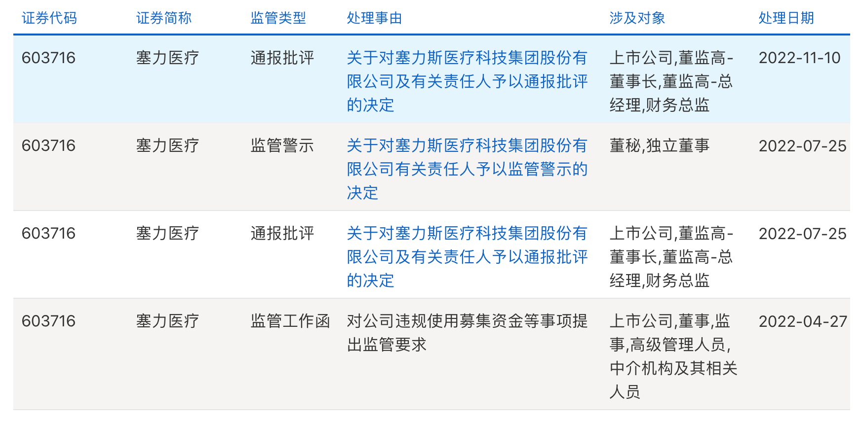 最终,鉴于上述违规事实和情节,经上交所纪律处分委员会审核通过,上交所决定对塞力医疗和时任董事长(代行董事会秘书)温伟、时任总经理王政、时任财务总监杨赞予以通报批评。对于上述纪律处分,交易所也将通报中国证监会,并记入上市公司诚信档案。