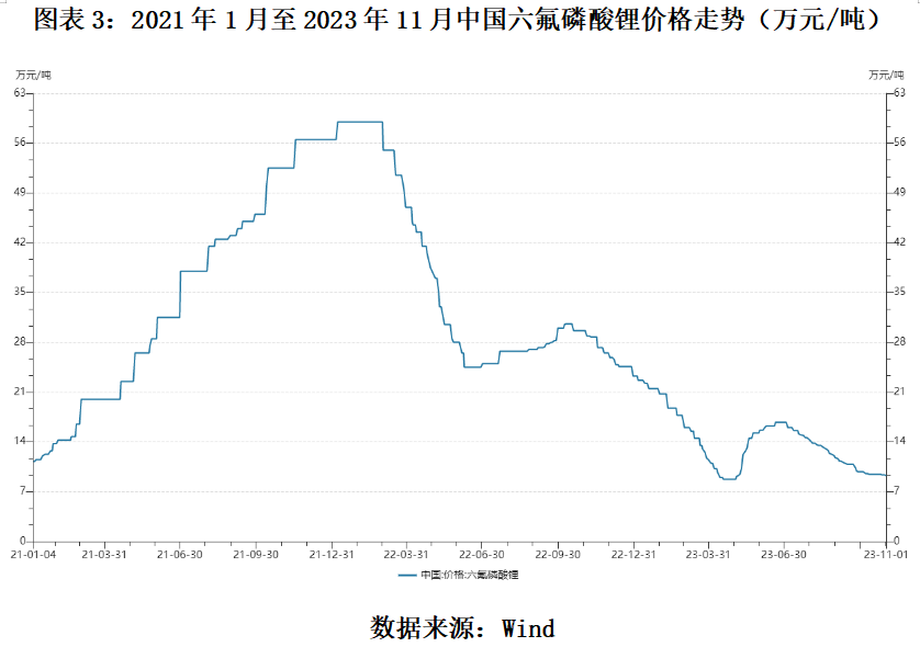 与此同时,六氟磷酸锂价格在2022—2023年出现跳水。Wind显示,2022年1月六氟磷酸锂一度涨至59万元/吨,2022年6月跌至24.5万元/吨左右,2023年11月1日跌至9.25万元/吨,较2022年最高峰时缩水84%。
