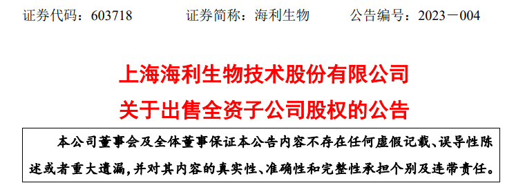 海利生物(603718)于4月12日发布公告称,上海海利生物技术股份有限公司拟向山东信得科技股份有限公司出售公司全资子公司山东海利生物制品有限公司100%股权,本次交易的价格为人民币 11,330 万元。本次交易完成后,公司不再持有山东海利的股权,山东海利将不再纳入公司合并报表范围。公司拟向上海智卓企业管理咨询有限公司出售全资子公司上海彩音生物科技有限公司100%股权,本次交易的价格为人民币 200 万元。本次交易完成后,公司不再持有彩音生物的股权,彩音生物将不再纳入公司合并报表范围。