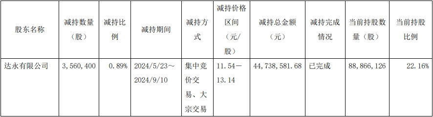 公告显示,达永有限本次减持价格区间为11.54元/股至13.14元/股,减持总金额44,738,581.68元。