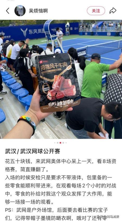 拇指风干牛肉这类零食包装干净并且不占地方,根本不愁安检带不进来。“花五十块钱来武网奥体中心呆上一天,看8场资格赛,简直赚翻了”,能及时补给能量不说,嚼着牛肉干看比赛,感觉精彩都加倍了。