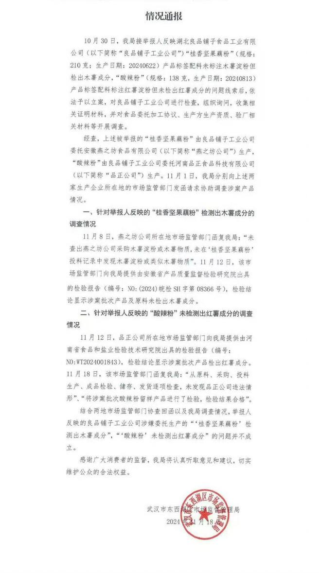 近日,武汉市东西湖区市监局对“良品铺子被打假”一事发布情况通报。其在通报中表示,结合两地市场监管部门协查回函以及我局调查情况,举报人反映的良品铺子工业公司涉嫌委托生产的“''桂香坚果藕粉’检测出木薯成分”,“''酸辣粉’未检测出红薯成分”的问题并不成立。