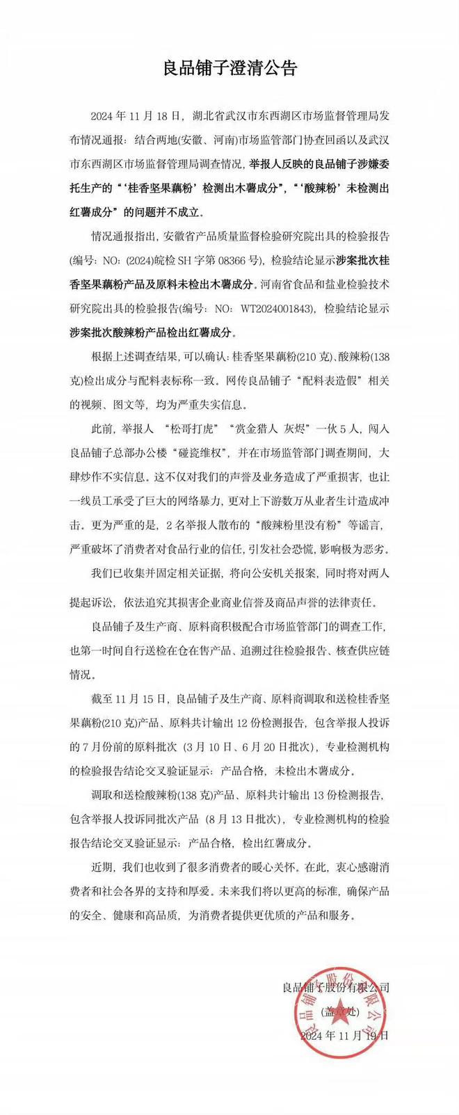 在武汉市东西湖区市监局发布通报后,良品铺子亦发布澄清公告称,根据上述调查结果,可以确认涉事产品检出成分与配料表标称一致,网传良品铺子“配料表造假”相关的视频、图文等,均为严重失实信息。举报人此前的“碰瓷维权”在对企业造成了严重损害的同时,也严重破坏了消费者对食品行业的信任,公司将向公安机关报案,并对两位举报人提起诉讼。