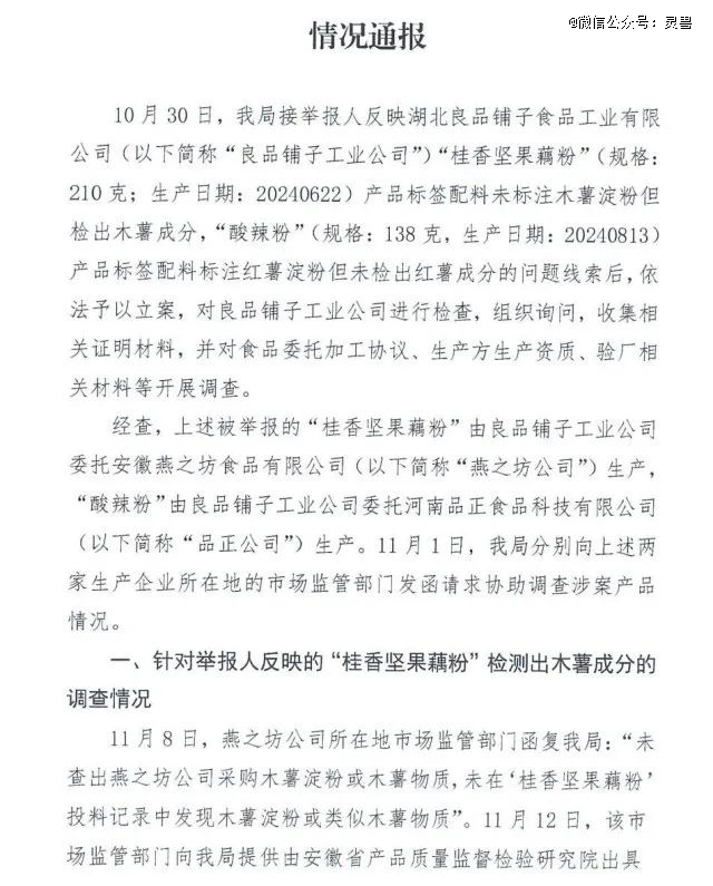 11月18日晚,武汉市东西湖区市场监督管理局发布通报称,良品铺子的“桂香坚果藕粉”(210克)和“酸辣粉”(138克)产品合格,举报人反映的问题不成立。
