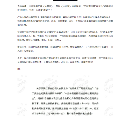 树欲静而风不止!在理性的吃瓜网友眼里,良品铺子卷入打假网红炮制的“配料表造假”风暴,在武汉市场监管部门官方发布的《情况通报》之后就该消停了,万万没想到,这群打假网红仍然不依不挠,妄图歪曲和片面解读虚假内容,继续恶意带节奏!
