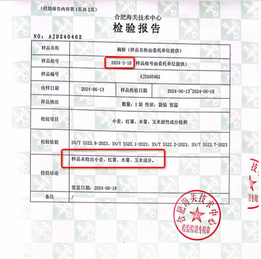 事实真相却是,良品铺子首批公布的检测报告中,就包括了3月份对藕粉原料的检测报告,检测结果明确显示并没有木薯成分,等于是直接打脸了“松哥打虎”一行的言论。