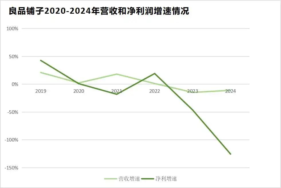 2020年起,公司的财务状况展现出较大的起伏:2020年,良品铺子营收和净利的增速分别由前一年的20.97%与42.68%骤降至2.32%与0.95%,2021年营收增速恢复至18.11%,净利又出现下降,且幅度达到18.06%,2022年,良品铺子的营收增速再次放缓,仅为1.24%,净利却迅速增长,增速达到19.16%;最终,良品铺子的营收和净利在2023、2024两年双双下降,且速度均在两位数。此外,公司主营业务的毛利率也自2021年下降到26.98%后再未超过28%,而这一指标此前常年保持在32%左右。