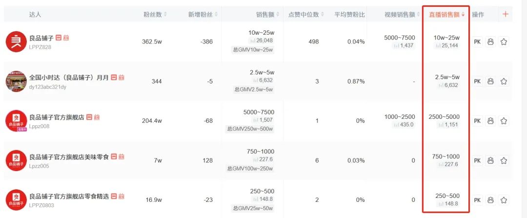 图:良品铺子在生鲜蔬果品类各直播间销售额,图源蝉妈妈