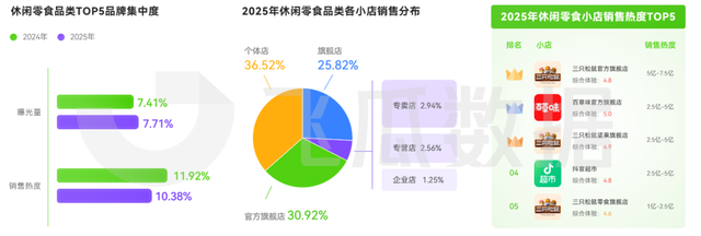 另据飞瓜数据,2025年休闲零食头部品牌销售集中度轻微下降。从小店的销售分布来看,个体店、官方旗舰店等多元主体共存,个体店占 36.52%,显示消费选择更分散,品牌需平衡曝光与销售转化,应对渠道多元挑战。
