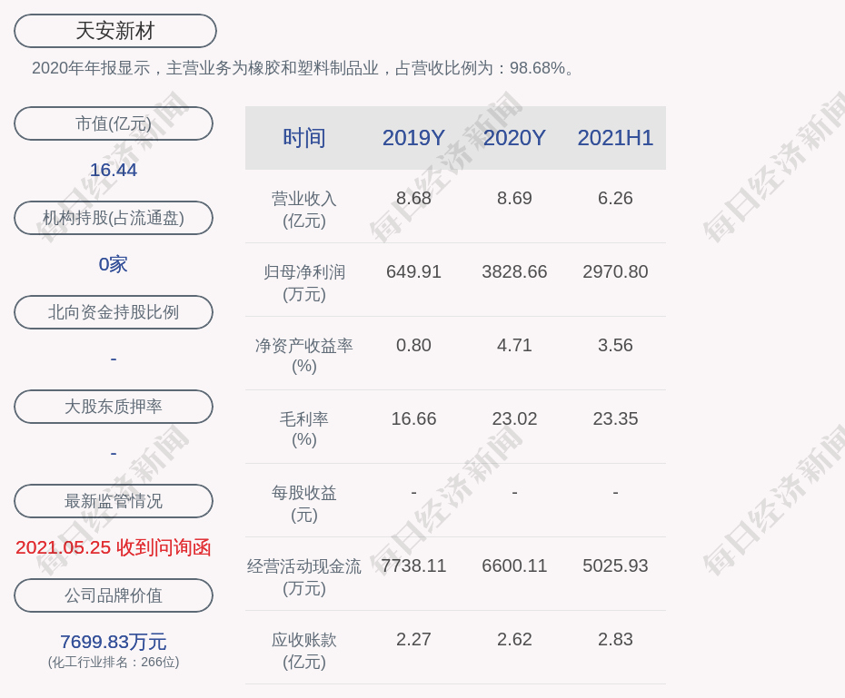 2020年年报显示,天安新材的主营业务为橡胶和塑料制品业,占营收比例为:98.68%。