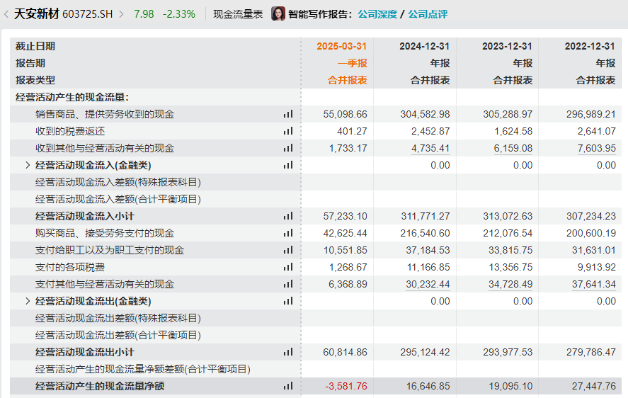 从历史数据上来看,天安新材正深受回款难和坏账的拖累。2022年~2024年,在营业收入基本稳定或增长的情况下,天安新材经营活动产生的现金流量净额呈逐年下降趋势,分别为2.74亿元、1.91亿元以及1.66亿元。2024年,天安新材还因为加大对房地产客户以及涉及诉讼客户单项计提应收款项坏账比例,而计提了727.75万元的信用减值损失。