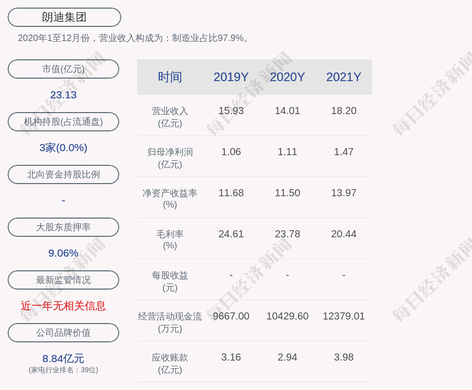 2020年1至12月份,朗迪集团的营业收入构成为:制造业占比97.9%。