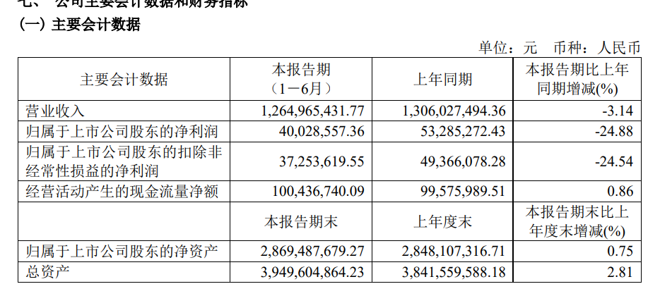 2024年半年度,鸣志电器营业收入12.65亿元,同比下降3.14%;归属于上市公司股东的净利润4003万元,较上年同期下降24.9%,实现归属于上市公司股东的扣除非经常性损益的净利润3725万元,较上年同期下降24.5%。