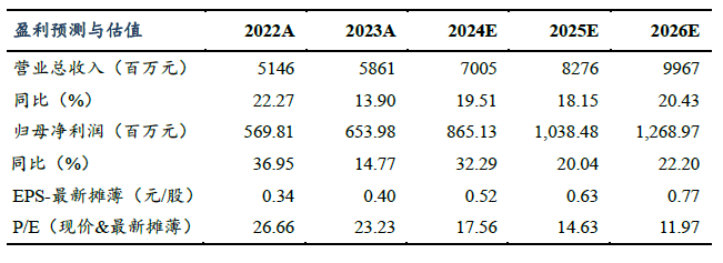 我们维持公司2024-2026年归母净利润分别为8.65亿元、10.38亿元、12.69亿元的预测,对应EPS分别为0.52元、0.63元、0.77元,市盈率分别为17.56倍、14.63倍、11.97倍,维持“买入”评级。