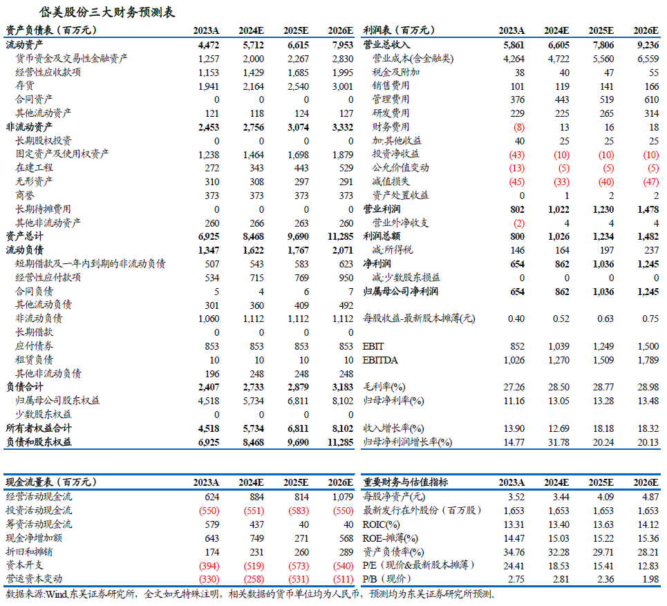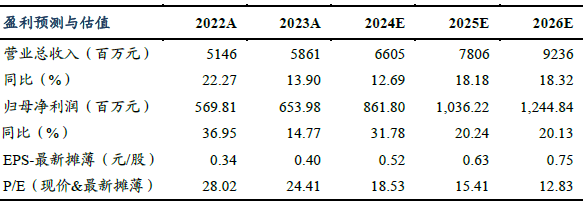 考虑到公司新项目的量产节奏,我们将公司2024-2026年归母净利润的预测调整为8.62亿元、10.36亿元、12.45亿元(前值为8.65亿元、10.38亿元、12.69亿元),对应2024-2026年EPS分别为0.52元、0.63元、0.75元(前值为0.52元、0.63元、0.77元),市盈率分别为18.53倍、15.41倍、12.83倍,维持“买入”评级。
