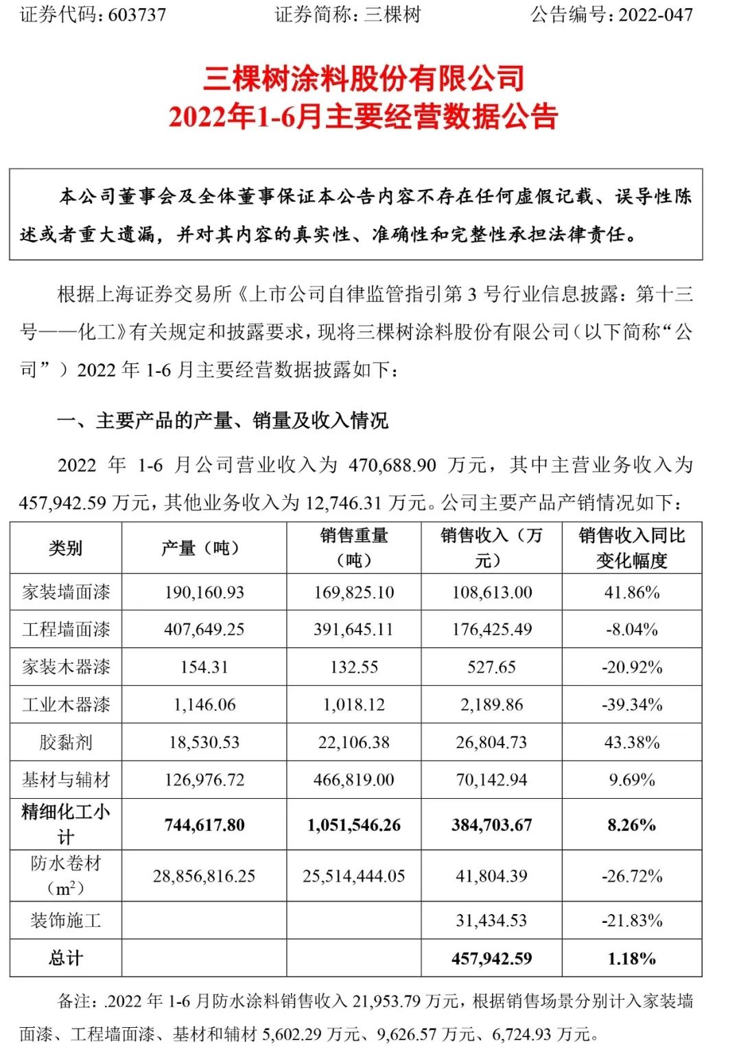 与此同时,三棵树2022年上半年主要经营数据显示,上半年防水卷材实现销售收入4.18亿元、防水涂料实现销售收入2.20亿元,两者合计为6.38亿元。