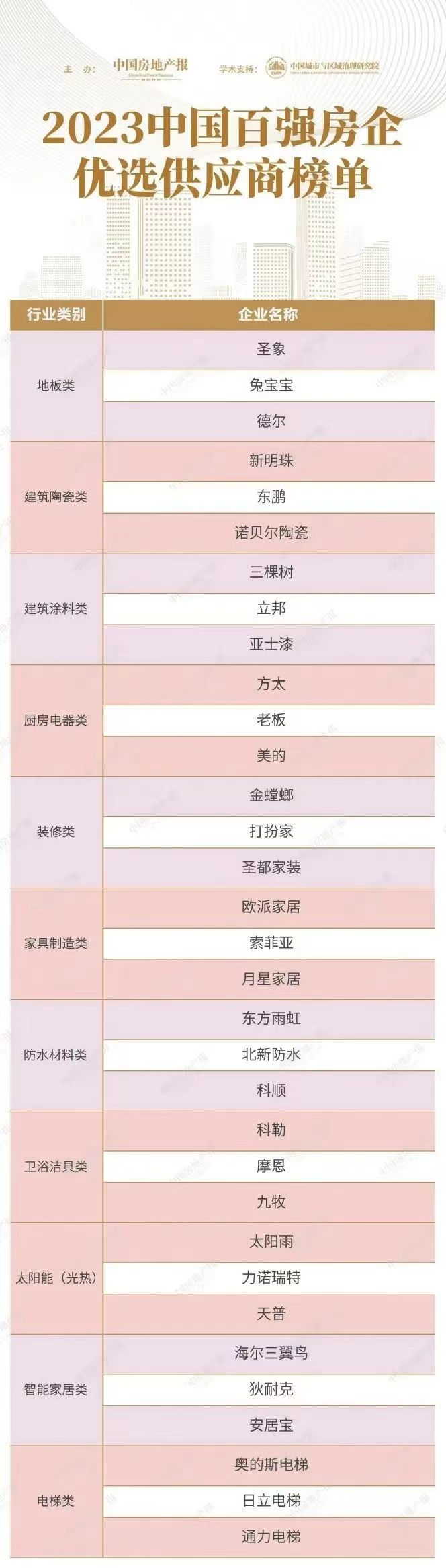 近日,由中国房地产报、中国城市与区域治理研究院联合主办的“2023第十三届中国房地产品牌发展大会”在北京召开。2023中国百强房企优选供应商榜单在会上揭晓。2023中国百强房企优选供应商榜单分为建筑涂料类、防水材料类等11大类,每大类三家企业上榜。建筑涂料类别,立邦、三棵树、亚士上榜;防水材料类别,东方雨虹、北新防水、科顺上榜。