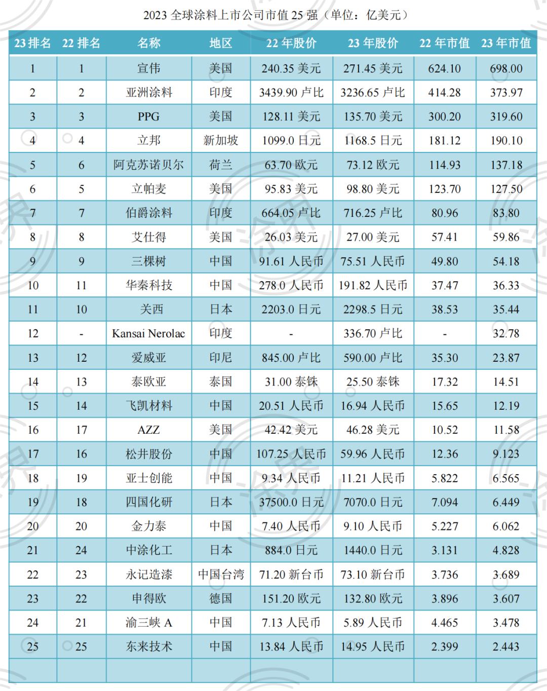 营业收入代表的是过去的成绩,市值则更多代表着市场对于一家公司未来的评价。9月11日,中国涂料行业专业财经媒体《涂界》(Coatings Industry)正式发布“2023全球涂料上市公司市值25强排行榜”,榜单按照全球上市涂料公司总市值进行排名(截止2023年9月8日收盘日)。